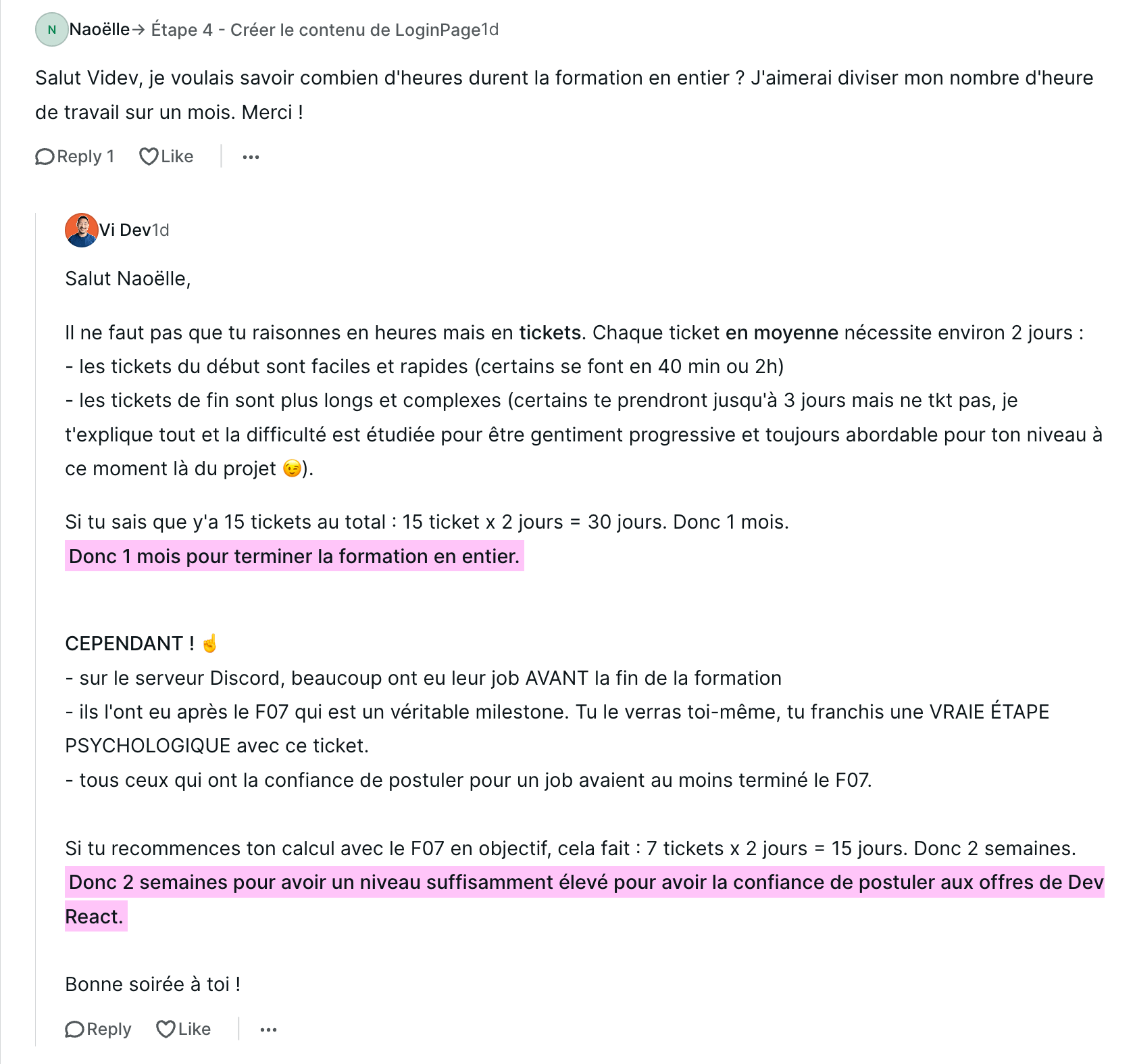 "Comme j'ai pu le conseiller Ă des personnes qui ont rejoint la formation avec mes conseils, React est trĂšs prisĂ© sur le marchĂ© du travail et attire beaucoup de dĂ©veloppeur mais il y a trĂšs peu de place pour des juniors. La formation de Vi est clairement un raccourci pour devenir un dĂ©veloppeur React confirmĂ© avec des bases solide et avoir des arguments pour sĂ©duire les recruteurs. Le meilleur Ă©chantillons de la formation est React en 1h de Vi sur Youtube. Si l'explication des bases de React par Vi t'as convaincu, n'hĂ©site plus. Il t'expliquera de la mĂȘme façon des notions plus avancĂ© de React et tu avanceras vraiment Ticket par Ticket vers la maĂźtrise de React."
